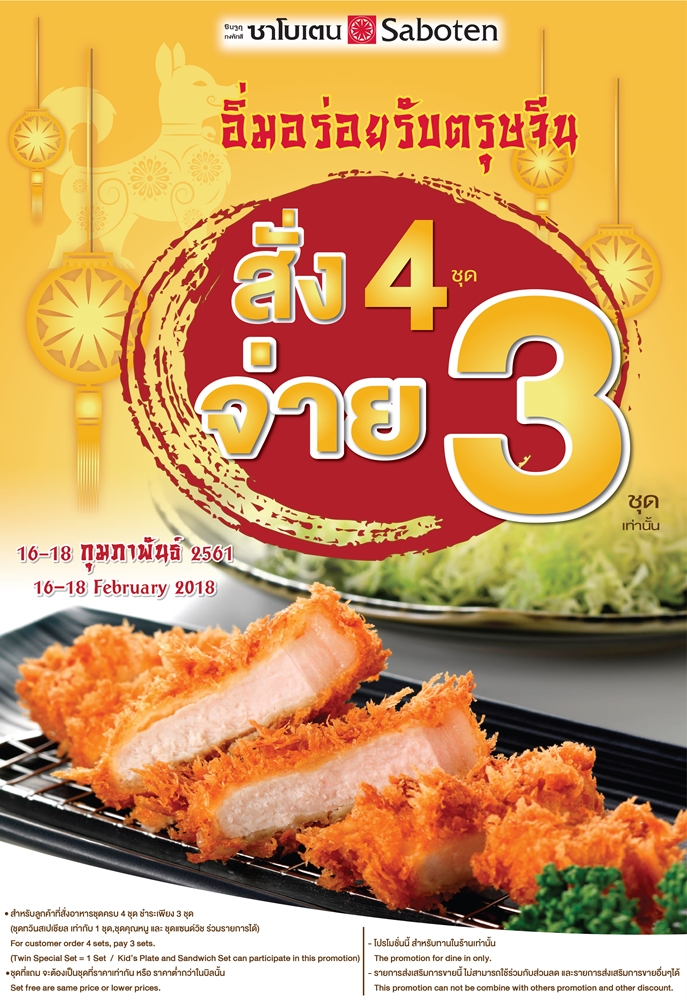 พามาอิ่มอร่อยเฮงๆ ในช่วงตรุษจีน หมูทอดข้างในนุ่มๆ ชุ่มฉ่ำ ด้านนอกกรอบสะท้านทรวงด้วยโปรโมชั่นสั่ง 4 ชุด จ่าย 3 ชุด! ตั้งแต่วันที่ 16-18 กุมภาพันธ์ 2561