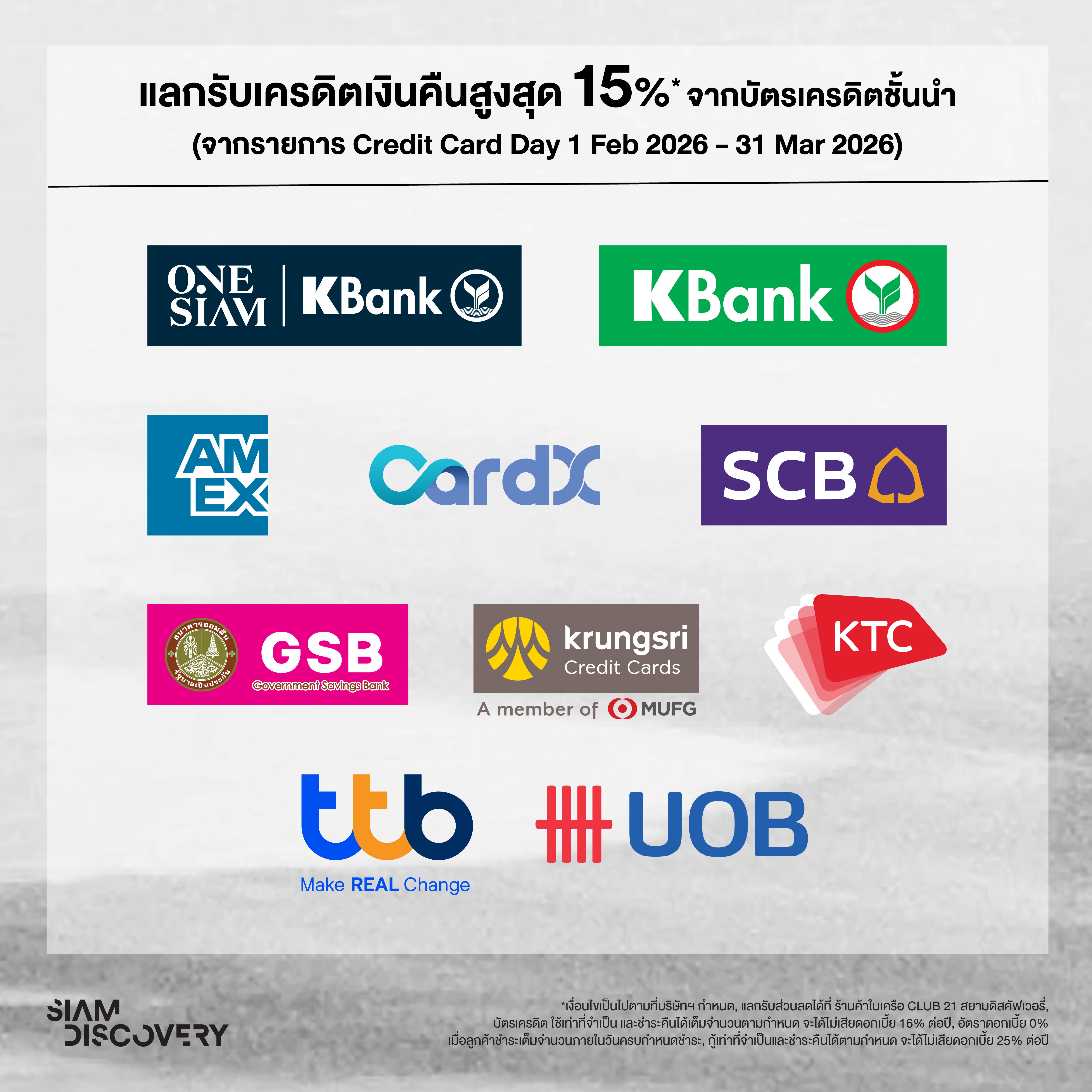 แลกรับเครดิตเงินคืนสูงสุด 15% จากบัตรเครดิตชั้นนำ (จากรายการ Credit Card Day 1 ก.พ. – 31 มี.ค. 69)