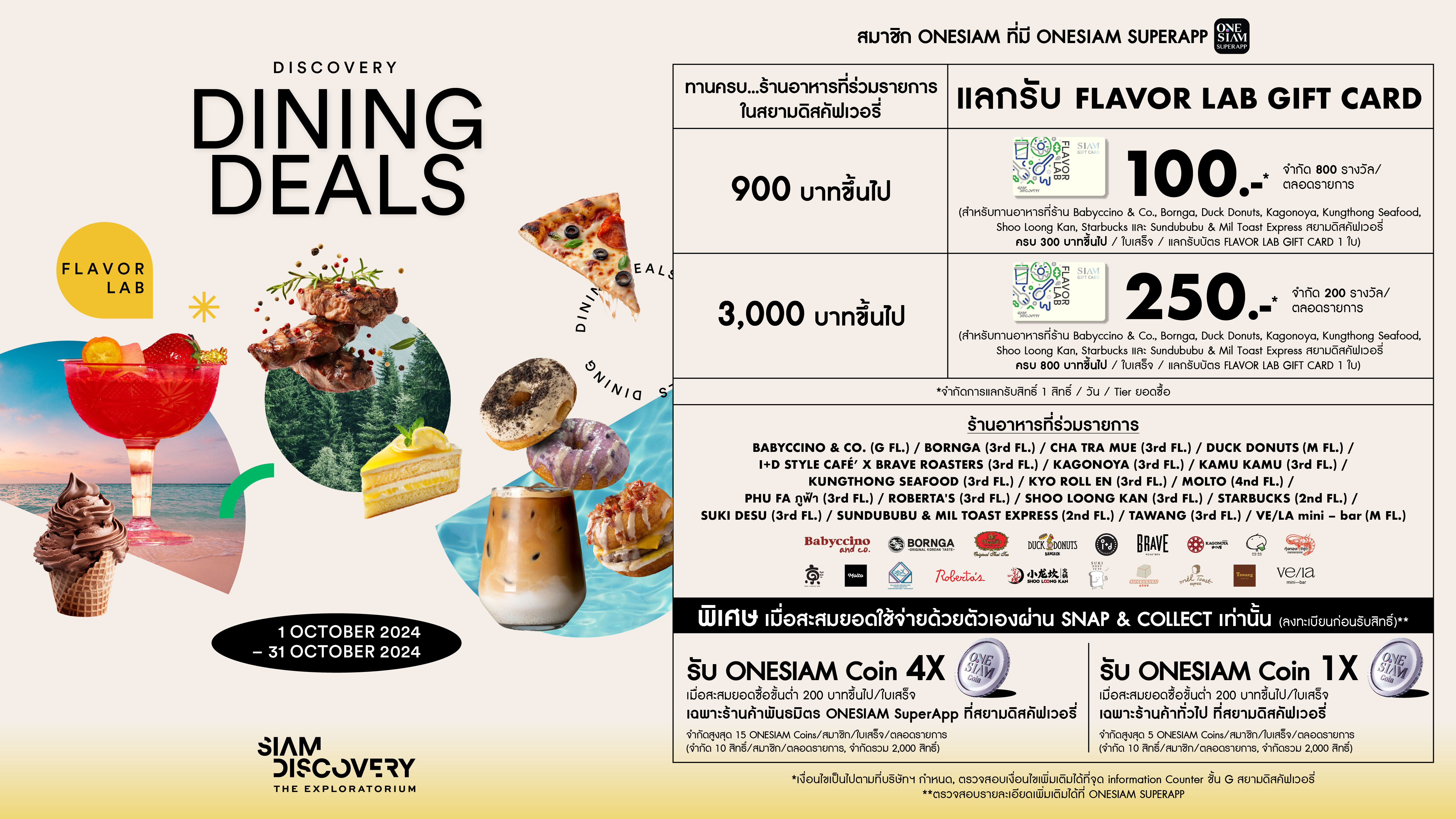 - ทานครบตามกำหนด ณ ร้านอาหารที่ร่วมรายการในสยามดิสคัฟเวอรี่ แลกรับบัตร FLAVOR LAB GIFT CARD มูลค่าสูงสุด 250 บาท*