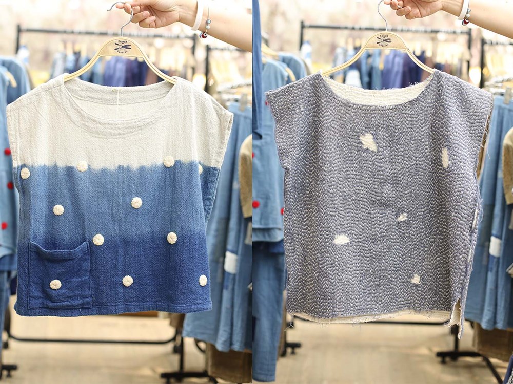 “เสื้อผ้าของเราจะมีสองส่วนคือ เอาเสื้อผ้ามือสองที่ใช้แล้วมาสร้างเป็นสิ่งใหม่ ก็จะมีปักเพิ่ม เย็บเพิ่ม กับอีกส่วนคือเอาวัตถุดิบจากธรรมชาติ ผ้าที่ย้อมสีธรรมชาติเอามาดีไซน์ บวกกับเทคนิคเย็บปักถักร้อย ซ่อมผ้าแบบชาวบ้านๆ ก็จะกลายเป็นงานดีไซน์ไป” เอกลักษณ์ที่เตะตาของฟาร์เมอร์ เรนเจอร์สคือเสื้อผ้าจะเหมือนกับปะชุนอยู่ ขาดแต่ไม่ขาดหมด สีผ้าไม่ต้องเรียบเสมอ เนื้อผ้านิ่มมากเหมือนๆ กับเสื้อผ้าตัวโปรดที่เราใส่มาหลายๆ ปี ในการสร้างงานออกมา คุณจามรเล่าให้ฟังเพิ่มว่า “ผ้าบางอย่างเราก็มีทำให้เหมือนเป็นผ้าเก่าธรรมชาติด้วย เราต้องเอามาขัด ถูหลายๆ รอบ เย็บซ้ำ แล้วขัดถูอีก ต้องเห็นแล้วเนียนตา” สีผ้าหลักๆ จะออกทางน้ำเงินจากครามและฮ่อม ฮ่อมนี้เป็นฮ่อมธรรมชาติ ที่คุณจามรบอกว่าหายากมากทีเดียว “ส่วนผ้าเก่าจริงๆ เราก็ไปเลือกมาพิเศษ เป็นผ้าฝ้ายที่ผ่านการใช้งานแล้ว และบางทีมีชิ้นเดียวเท่านั้นด้วย”