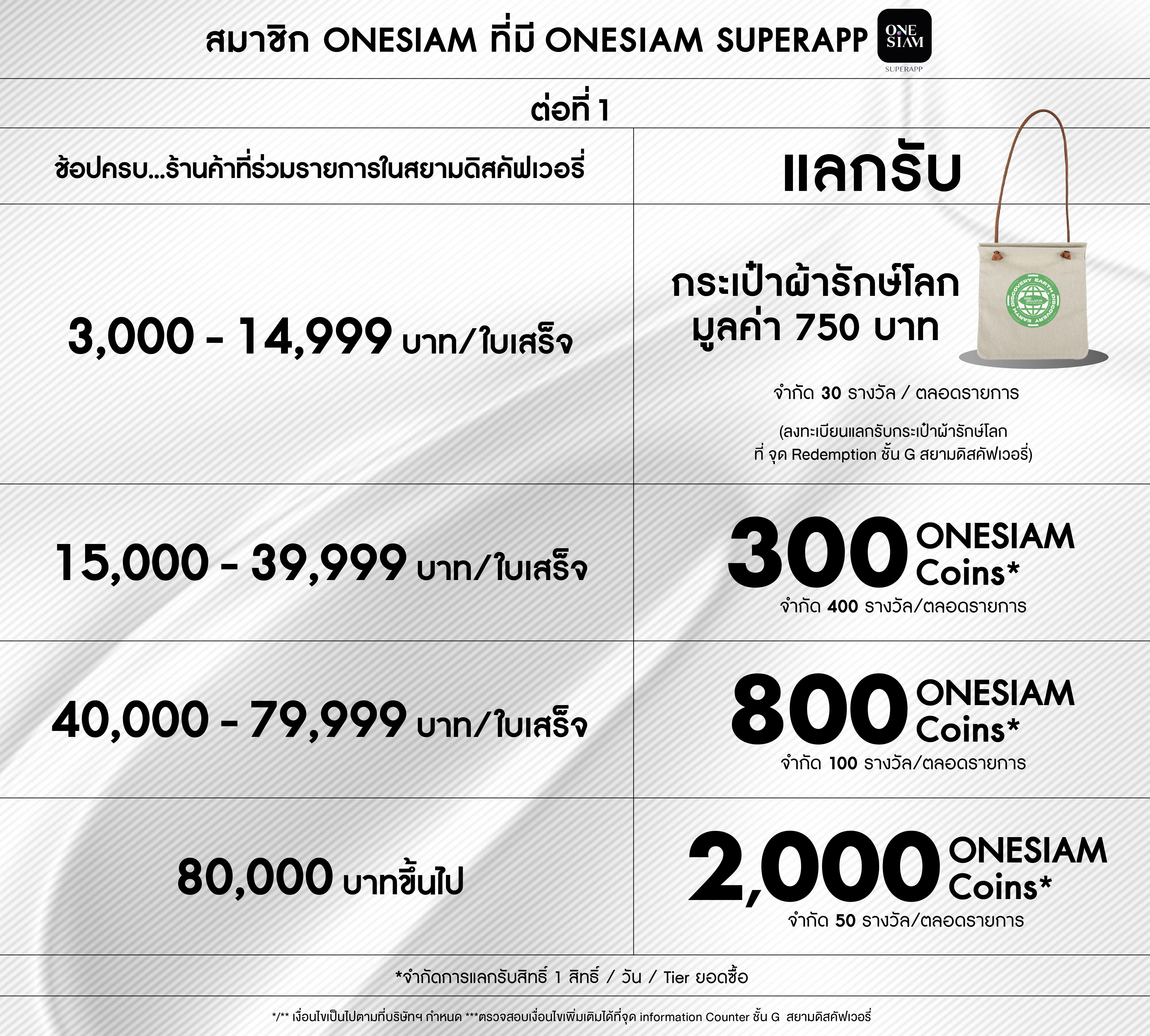 ต่อที่ 2: รับ 1 ONESIAM Coin เมื่อช้อปครบทุก 1,000 บาท/ใบเสร็จ**