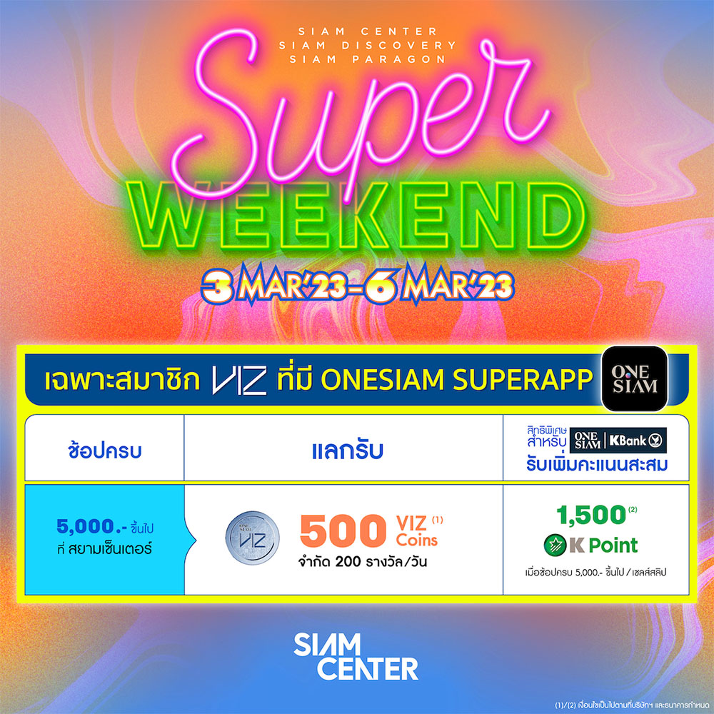 พิเศษสำหรับสมาชิก VIZ ที่มี ONESIAM SuperApp ช้อปสินค้าจากร้านค้าที่ร่วมรายการในศูนย์การค้าสยามพารากอน สยามเซ็นเตอร์และสยามดิสคัฟเวอรี่ ครบตามยอดซื้อและเงื่อนไขที่กำหนด แลกรับ VIZ COIN(1) พร้อมรับเพิ่มคะแนนสะสม K POINT(2) เมื่อใช้จ่ายผ่านบัตรเครดิตวันสยามกสิกรไทย