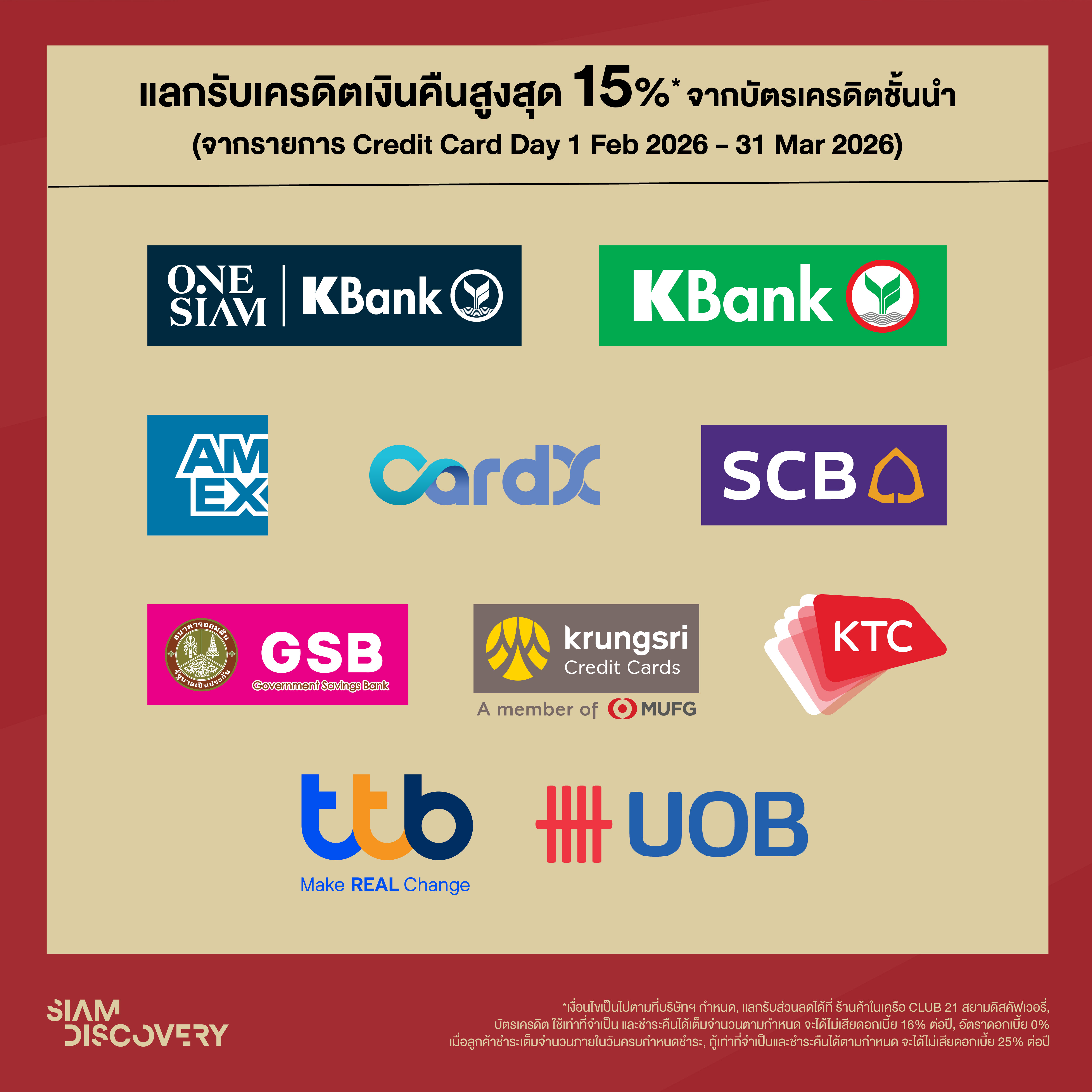 แลกรับเครดิตเงินคืนสูงสุด 15% จากบัตรเครดิตชั้นนำ (จากรายการ Credit Card Day 1 ก.พ. – 31 มี.ค. 69)