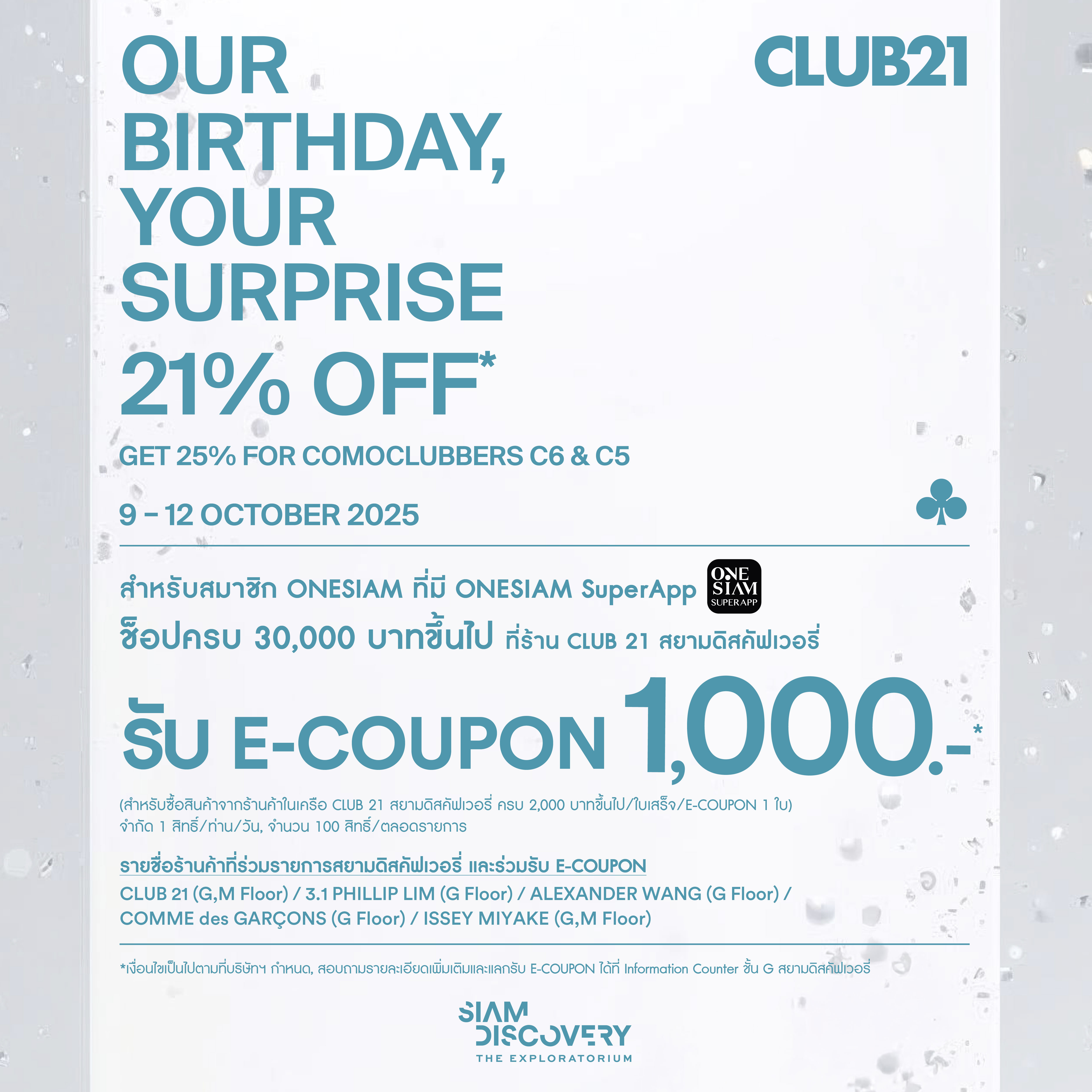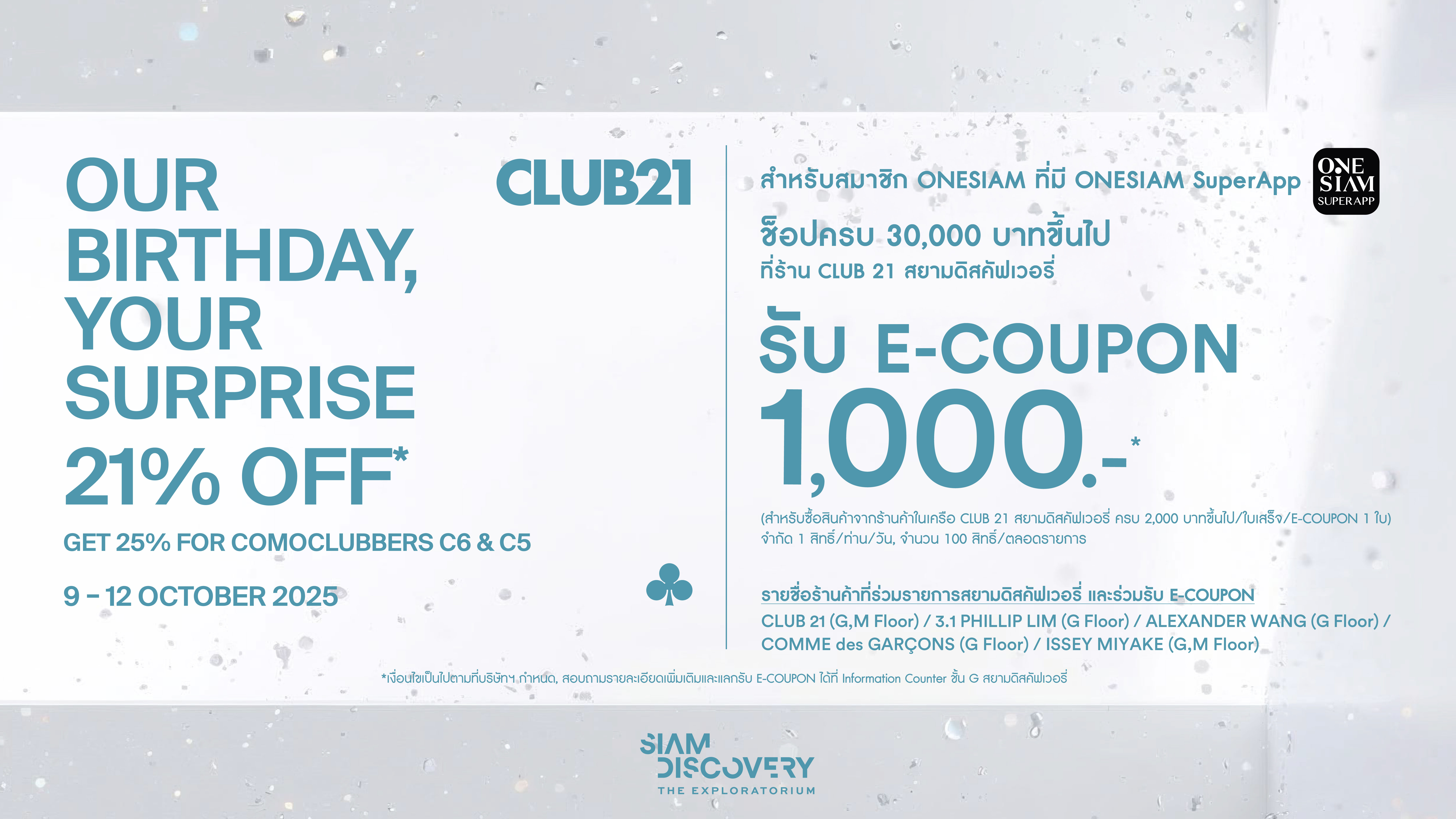ช็อปครบ 30,000 บาทขึ้นไป ที่ร้านในเครือ CLUB 21 สยามดิสคัฟเวอรี่แลกรับ E-COUPON มูลค่า 1,000 บาท (สำหรับซื้อสินค้าจากร้านค้าในเครือ CLUB 21 สยามดิสคัฟเวอรี่ ครบ 2,000 บาทขึ้นไป/ใบเสร็จ/E-COUPON 1 ใบ) จำกัด 1 สิทธิ์/ท่าน/วัน, จำนวน 100 สิทธิ์/ตลอดรายการ