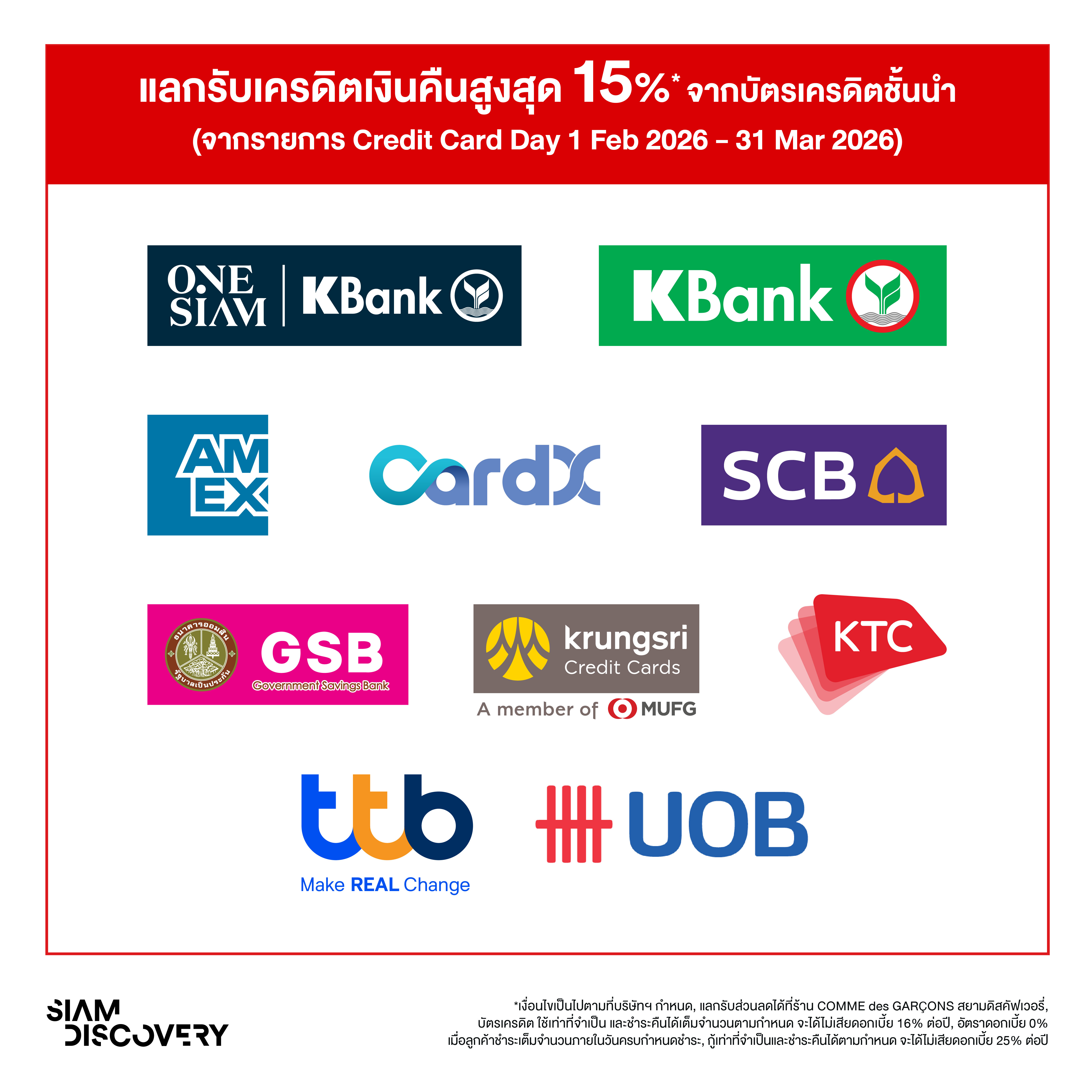 แลกรับเครดิตเงินคืนสูงสุด 15% จากบัตรเครดิตชั้นนำ (จากรายการ Credit Card Day 1 ก.พ. – 31 มี.ค. 69)