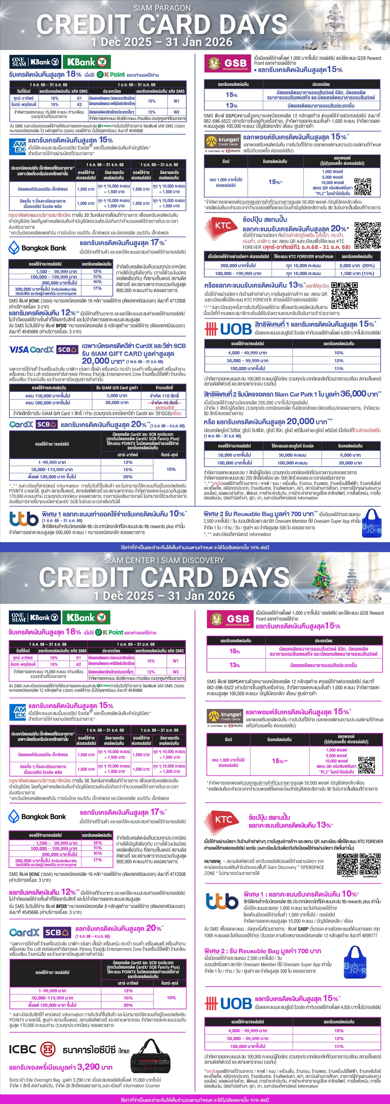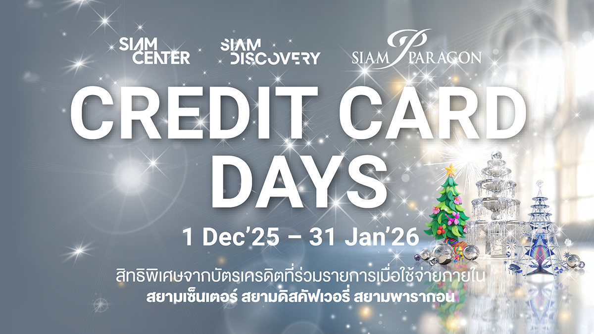 พกบัตรเครดิต มาช็อปกับรายการ Credit Card days แลกคะแนนรับเครดิตเงินคืนสูงสุด 20%* เมื่อช็อปครบตามเงื่อนไข หรือแบ่งชำระ Siam Gift Card 0%* นานสูงสุด 6 เดือน ที่สยามพารากอน สยามเซ็นเตอร์ และสยามดิสคัฟเวอรี่