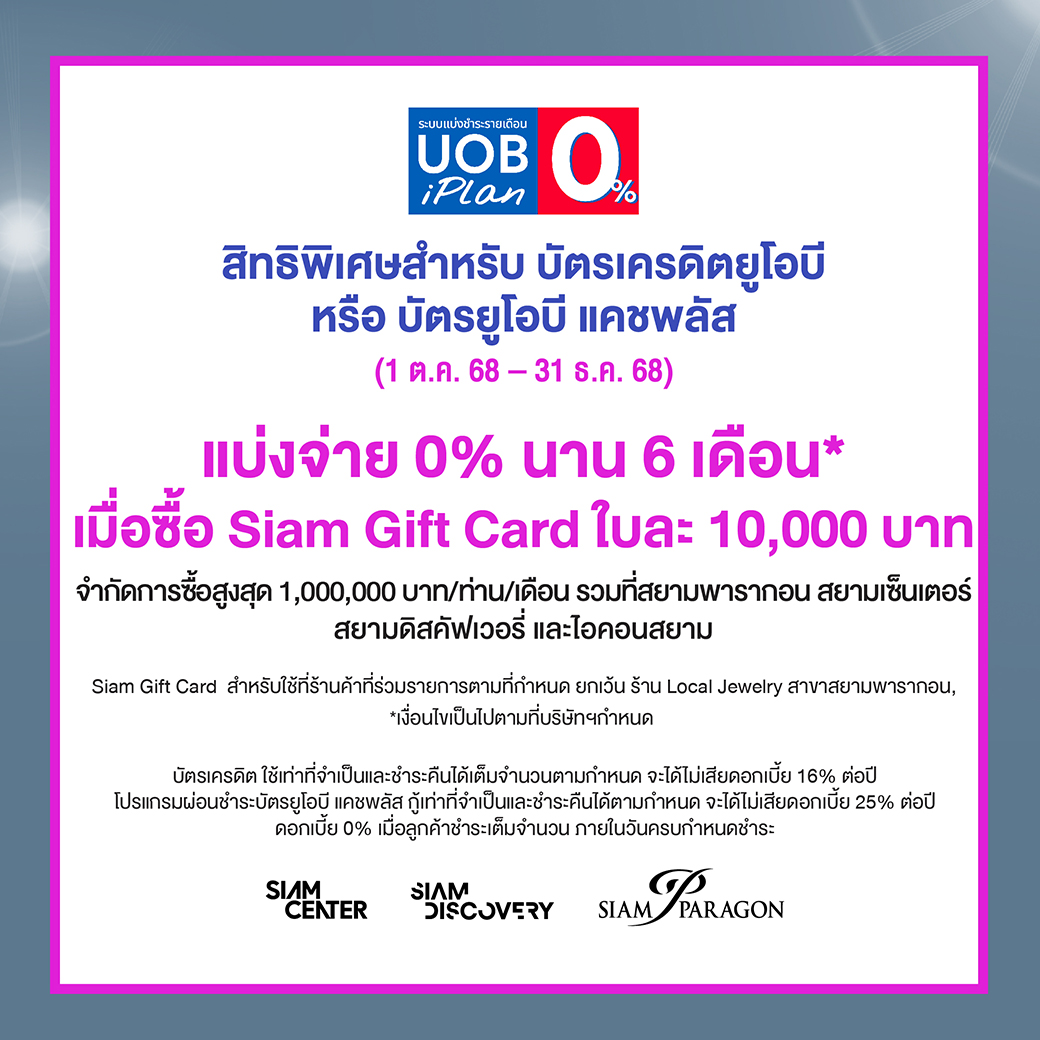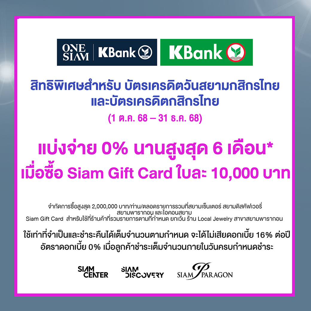 - แบ่งจ่าย 0% นาน 6 เดือน* เมื่อซื้อ Siam Gift Card ใบละ 10,000 บาท (ไม่จำกัดยอดซื้อ)