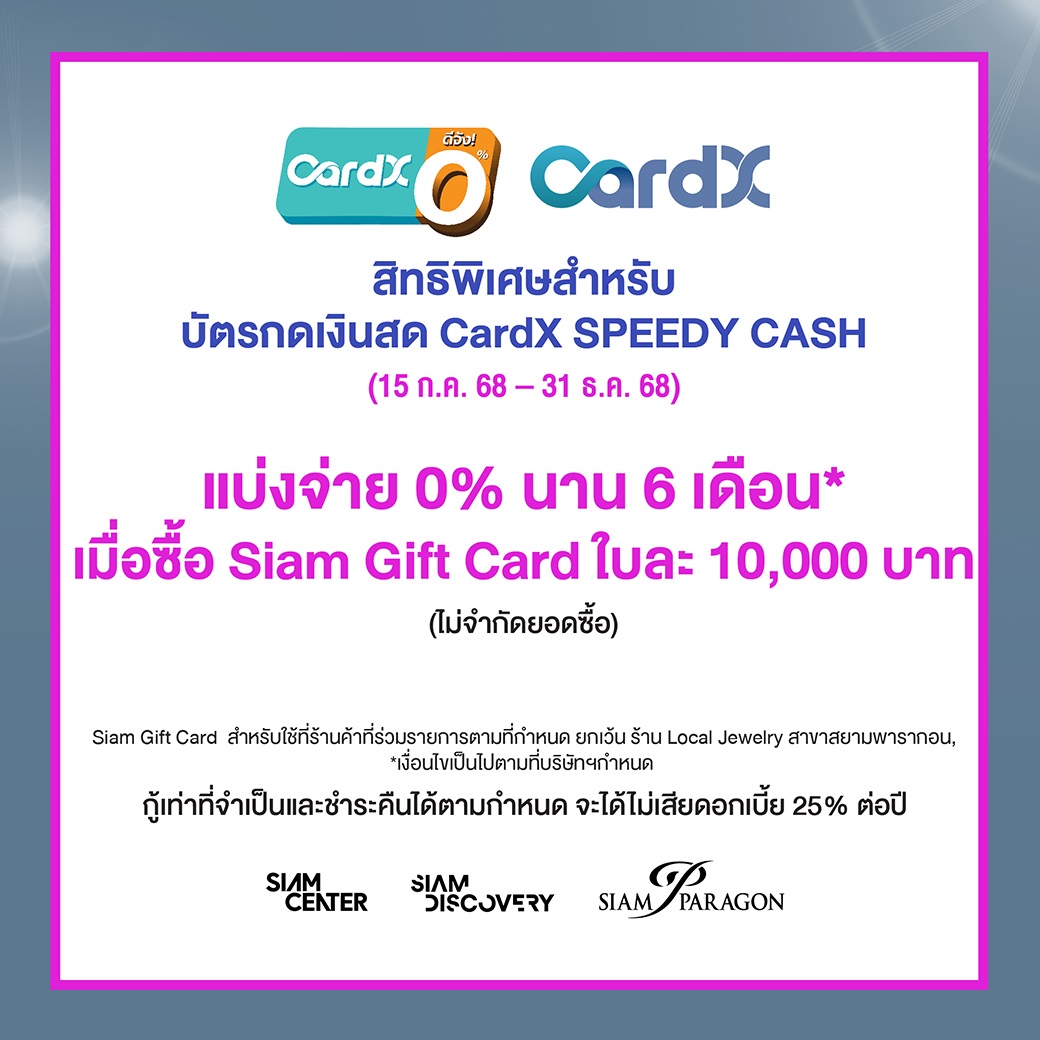 - แบ่งจ่าย 0% นาน 6 เดือน* เมื่อซื้อ Siam Gift Card ใบละ 10,000 บาท