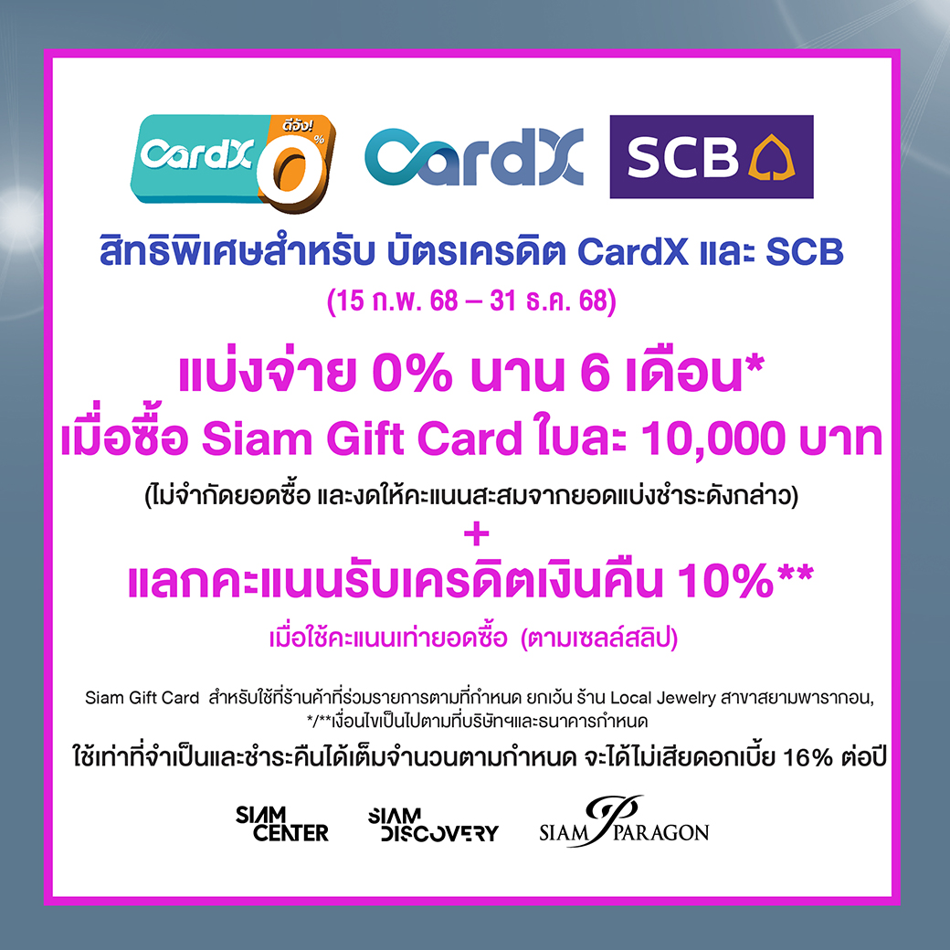 - แบ่งจ่าย 0% นาน 6 เดือน* เมื่อซื้อ Siam Gift Card ใบละ 10,000 บาท (ไม่จำกัดยอดซื้อ และงดให้คะแนนสะสมจากยอดแบ่งชำระดังกล่าว)