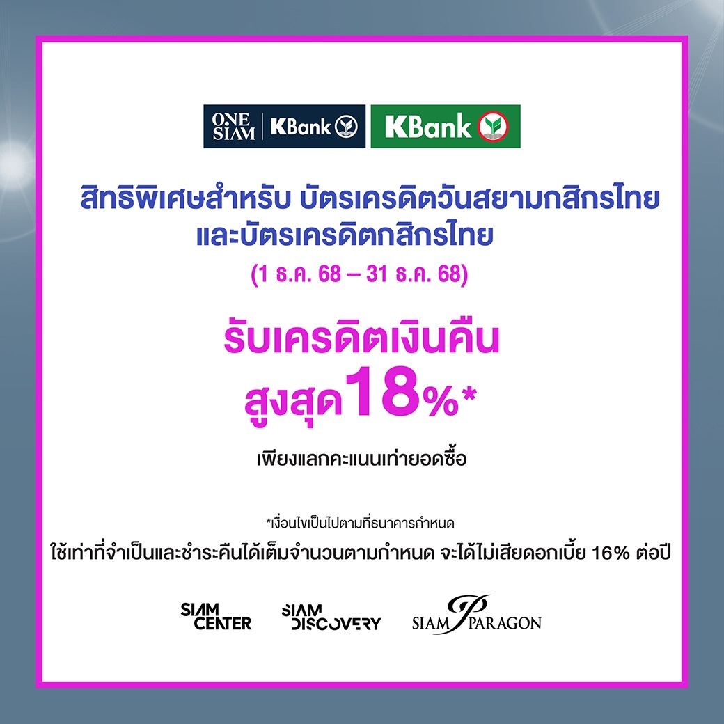 สิทธิพิเศษสำหรับ บัตรเครดิตวันสยามกสิกรไทยและบัตรเครดิตกสิกรไทย (1 ธ.ค. 68 - 31 ธ.ค. 68)