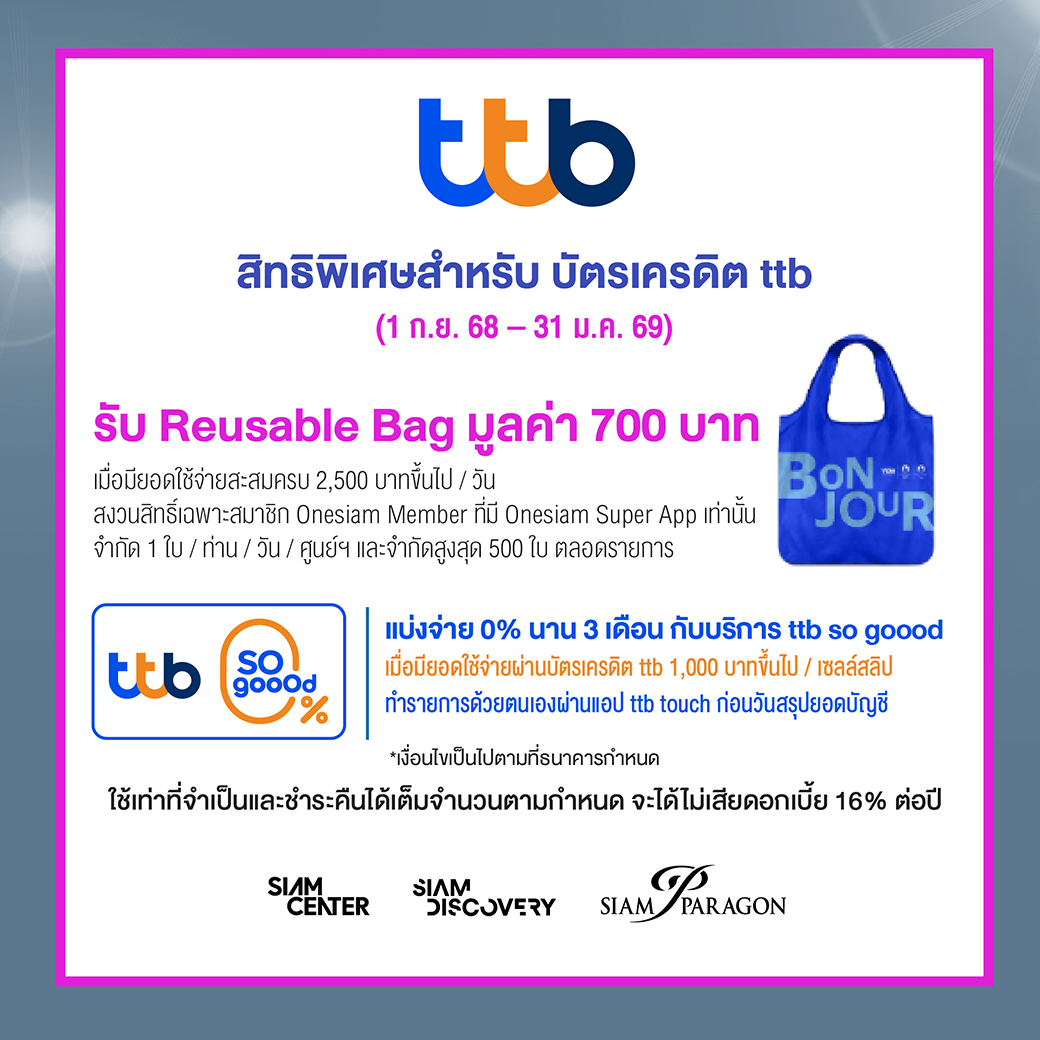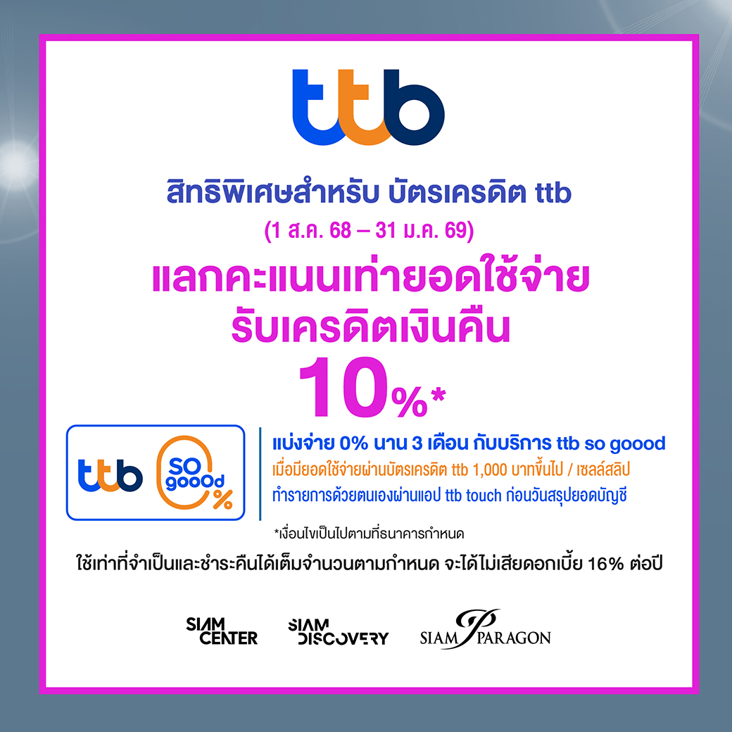 สิทธิพิเศษสำหรับ บัตรเครดิต ttb (1 ส.ค. 68 - 31 ม.ค. 69)