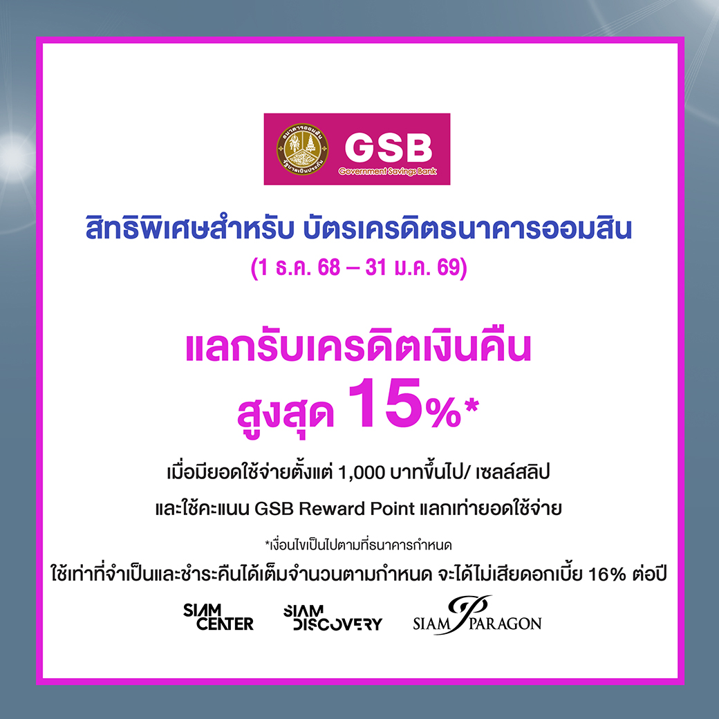 - แลกรับเครดิตเงินคืนสูงสุด 15%* เมื่อมียอดใช้จ่ายตั้งแต่ 1,000 บาทขึ้นไป/เซลล์สลิปและใช้คะแนน GSB Reward Point แลกเท่ายอดใช้จ่าย