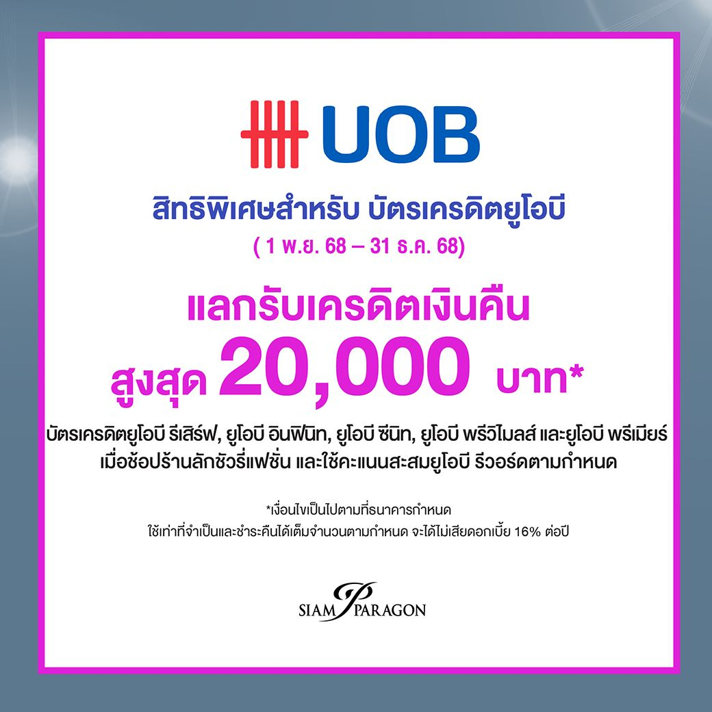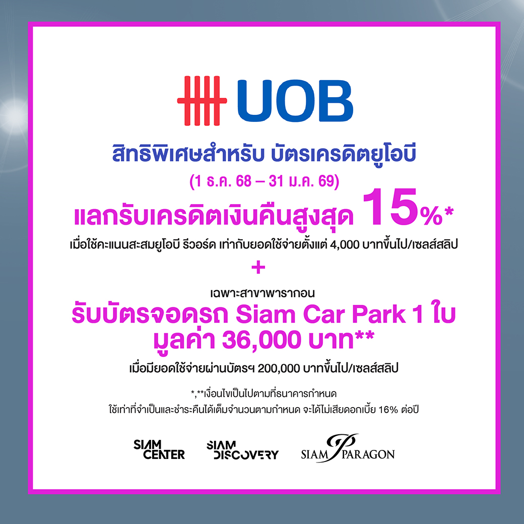 - แลกรับเครดิตเงินคืนสูงสุด 15%* เมื่อใช้คะแนนสะสมยูโอบี รีวอร์ด เท่ากับยอดใช้จ่ายตั้งแต่ 4,000 บาทขึ้นไป/เซลล์สลิป + เฉพาะสาขาพารากอน รับบัตรจอดรถ Siam Car Park 1 ใบ มูลค่า 36,000 บาท* เมื่อมียอดใช้จ่ายผ่านบัตรฯ 200,000 บาทขึ้นไป/เซลส์สลิป