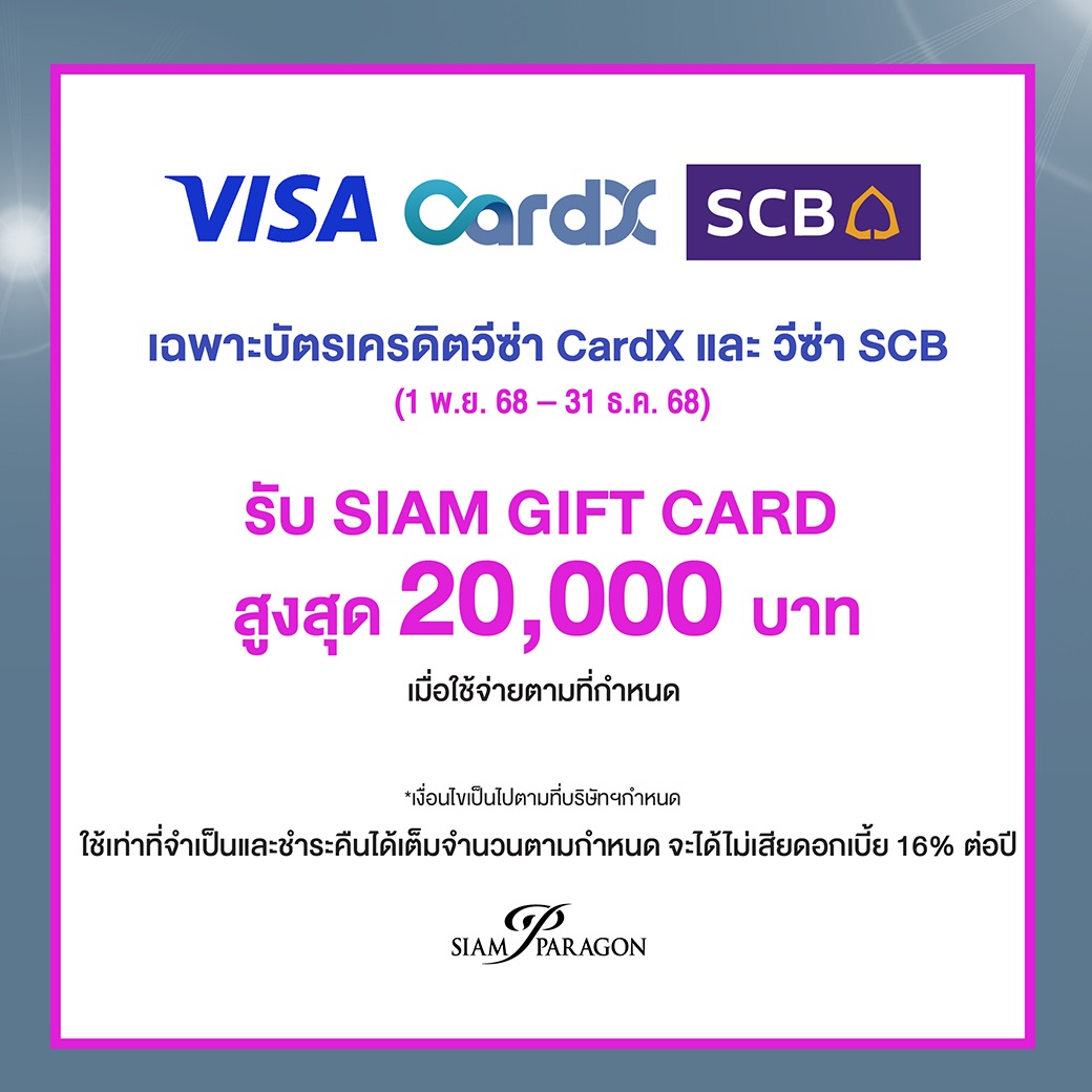 - รับ SIAM GIFT CARD สูงสุด 20,000 บาท* เมื่อใช้จ่ายตามที่กำหนด
