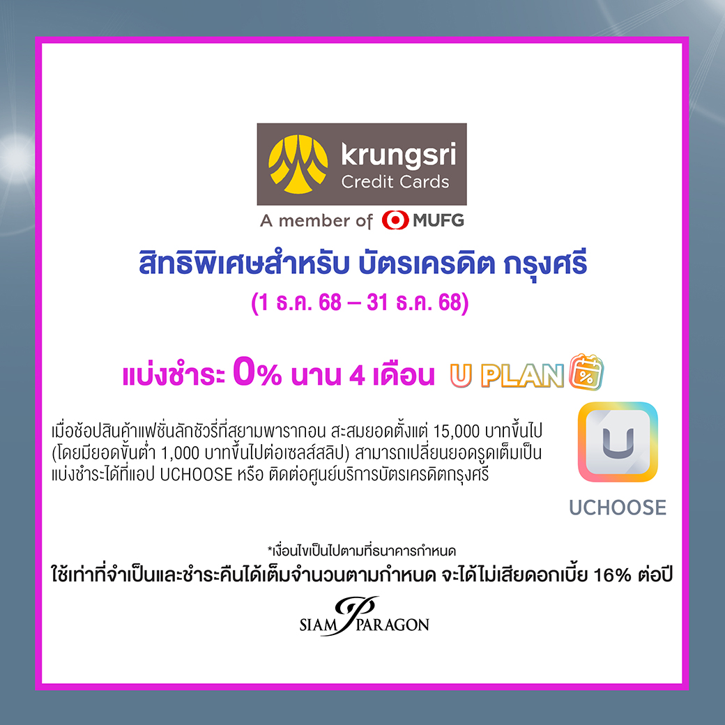 เมื่อช็อปสินค้าแฟชั่นลักชัวรีที่สยามพารากอน สะสมยอดตั้งแต่ 15,000 บาทขึ้นไป (โดยมียอดขั้นต่ำ 1,000 บาทขึ้นไปต่อเซลล์สลิป) สามารถเปลี่ยนยอดรูดเต็มเป็นแบ่งชำระได้ที่แอป UCHOOSE หรือ ติดต่อศูนย์บริการบัตรเครดิตกรุงศรี