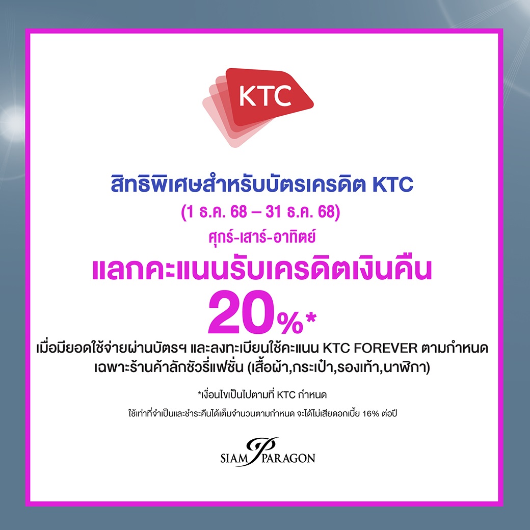 - แลกคะแนนรับเครดิตเงินคืน 20%* เมื่อมียอดใช้จ่ายผ่านบัตรฯ และลงทะเบียนใช้คะแนน KTC FOREVER ตามกำหนดเฉพาะร้านค้าลักชัวรี่แฟชั่น (เสื้อผ้า,กระเป๋า,รองเท้า,นาฬิกา)