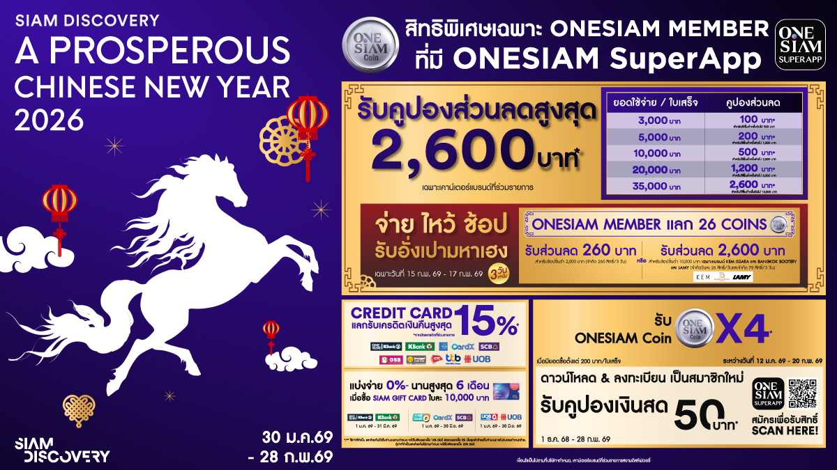 ดีลเฮงพิเศษ จ่าย ไหว้ ช็อป แลก 26 ONESIAM Coin รับอั่งเปาส่วนลดสูงสุด 2,600 บาท* เฉพาะ 15 ก.พ. 69 – 17 ก.พ. 69 (3 วันเท่านั้น)
