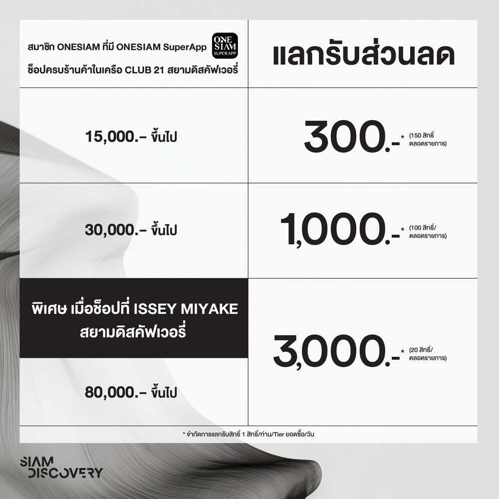 พิเศษ สำหรับสมาชิก ONESIAM ที่มี ONESIAM SuperApp ช็อปสินค้าแบรนด์ดังในเครือ CLUB 21 ที่สยามดิสคัฟเวอรี่