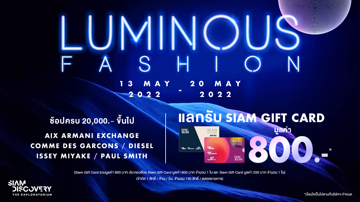 ช้อปสินค้าในแผนกที่ร่วมรายการในสยามดิสคัฟเวอรี่ครบ 20,000 บาทขึ้นไป แลกรับ Siam Gift Card มูลค่า 800 บาท (ประกอบด้วย Siam Gift Card มูลค่า 600 บาท จำนวน 1 ใบ และ Siam Gift Card มูลค่า 200 บาท จำนวน 1 ใบ)