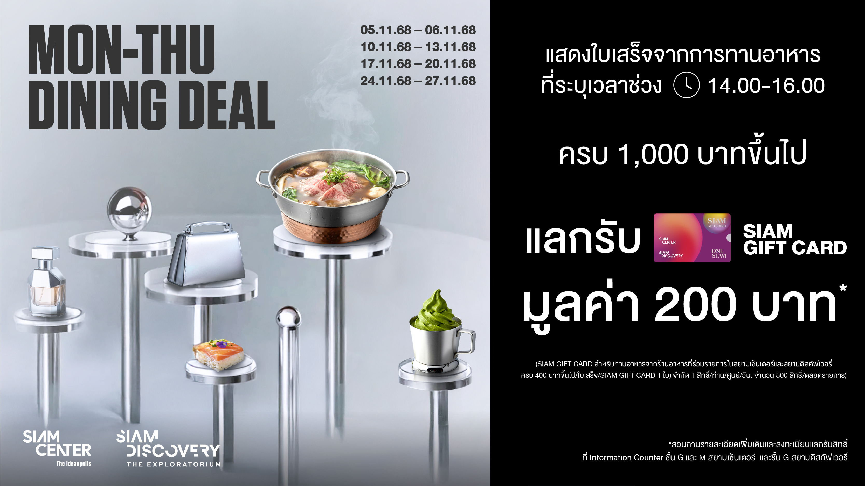 แสดงใบเสร็จจากการทานอาหารที่สยามเซ็นเตอร์และสยามดิสคัฟเวอรี่ ที่ระบุเวลาช่วง 14.00-16.00 ครบ 1,000 บาทขึ้นไป แลกรับ SIAM GIFT CARD มูลค่า 200 บาท (SIAM GIFT CARD สำหรับทานอาหารจากร้านอาหารที่ร่วมรายการในสยามเซ็นเตอร์และสยามดิสคัฟเวอรี่ ครบ 400 บาทขึ้นไป/ใบเสร็จ/SIAM GIFT CARD 1 ใบ) จำกัด 1 สิทธิ์/ท่าน/ศูนย์/วัน, รวมจำนวน 500 สิทธิ์/ตลอดรายการ สยามเซ็นเตอร์และสยามดิสคัฟเวอรี่)