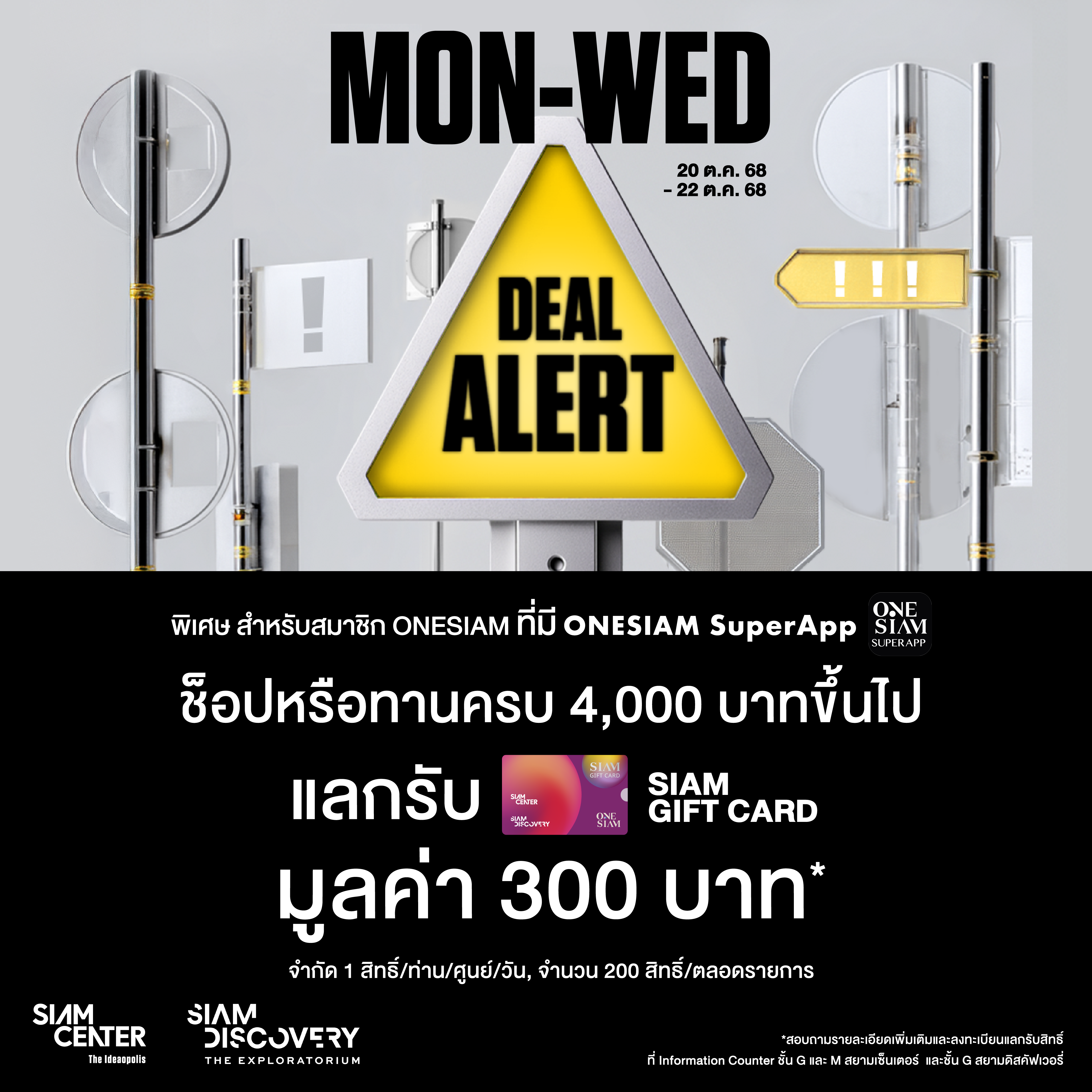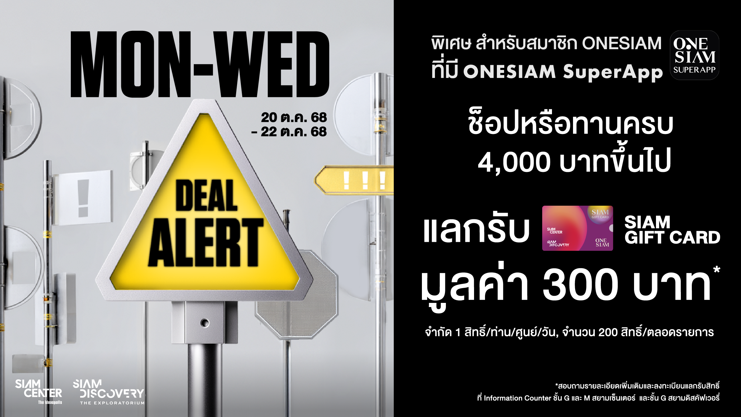 พิเศษ สำหรับสมาชิก ONESIAM ที่มี ONESIAM SuperApp ช็อปและทานอาหารจากร้านค้าและร้านอาหารในสยามเซ็นเตอร์และสยามดิสคัฟเวอรี่ ครบ 4,000 บาทขึ้นไป แลกรับ SIAM GIFT CARD มูลค่า 300 บาท (SIAM GIFT CARD สำหรับซื้อสินค้าหรือทานอาหารจากร้านค้าและร้านอาหารที่ร่วมรายการในสยามเซ็นเตอร์และสยามดิสคัฟเวอรี่ ครบ 600 บาทขึ้นไป/ใบเสร็จ/SIAM GIFT CARD 1 ใบ) จำกัด 1 สิทธิ์/ท่าน/ศูนย์/วัน, จำนวน 200 สิทธิ์/ตลอดรายการ)