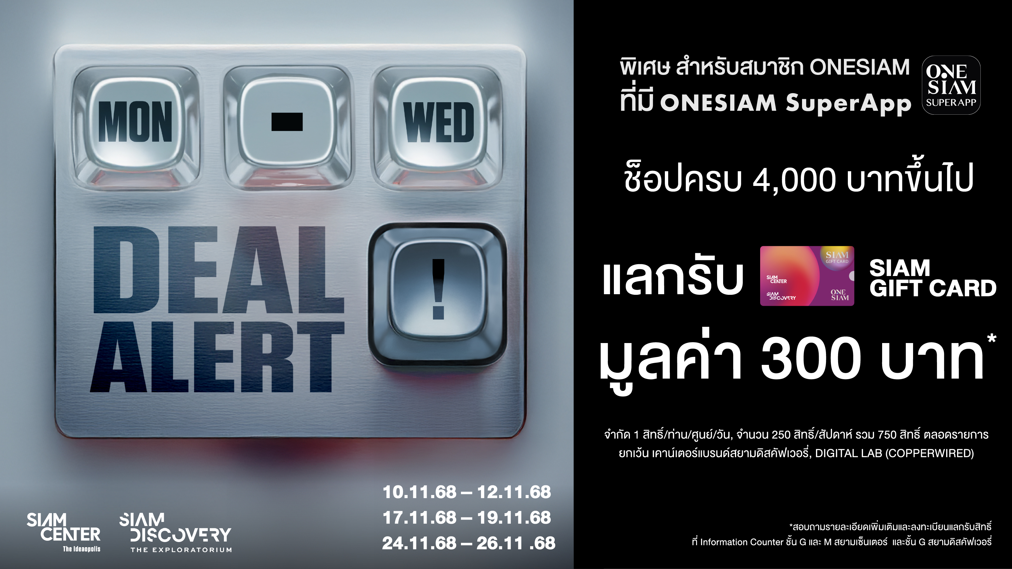 พิเศษ สำหรับสมาชิก ONESIAM ที่มี ONESIAM SuperApp ช็อปหรือทานอาหารจากร้านค้าและร้านอาหารในสยามเซ็นเตอร์และสยามดิสคัฟเวอรี่ ครบ 4,000 บาทขึ้นไป แลกรับ SIAM GIFT CARD มูลค่า 300 บาท (SIAM GIFT CARD สำหรับซื้อสินค้าหรือทานอาหารจากร้านค้าและร้านอาหารที่ร่วมรายการในสยามเซ็นเตอร์และสยามดิสคัฟเวอรี่ ครบ 600 บาทขึ้นไป/ใบเสร็จ/SIAM GIFT CARD 1 ใบ) จำกัด 1 สิทธิ์/ท่าน/ศูนย์/วัน, จำนวน 250 สิทธิ์/สัปดาห์ รวม 750 สิทธิ์ ตลอดรายการ สยามเซ็นเตอร์และสยามดิสคัฟเวอรี่)