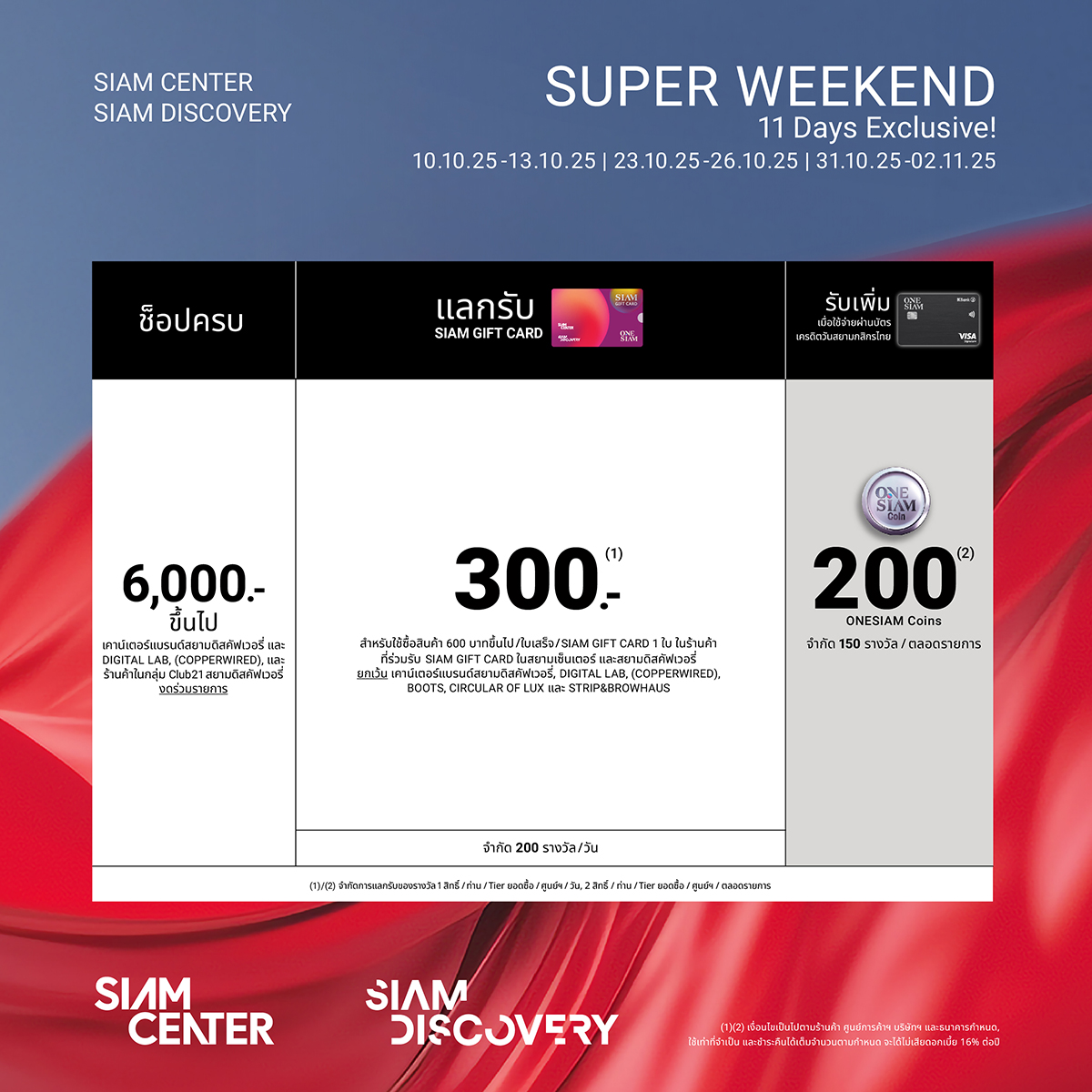 - SIAM GIFT CARD มูลค่า 300 บาท (ที่ได้รับจากการแลกรับสิทธิ์ที่สยามเซ็นเตอร์ และ สยามดิสคัฟเวอรี่) สำหรับใช้ซื้อสินค้า 600 บาทขึ้นไป / ใบเสร็จ / SIAM GIFT CARD 1 ใบ ในร้านค้าที่ร่วมรับ SIAM GIFT CARD ในสยามเซ็นเตอร์ และ สยามดิสคัฟเวอรี่ ยกเว้น เคาน์เตอร์แบรนด์สยามดิสคัฟเวอรี่, DIGITAL LAB (COPPERWIRED), BOOTS, CIRCULAR OF LUX และ STRIP&BROWHAUS สยามดิสคัฟเวอรี่ มีอายุการใช้งานถึงวันที่ 30 พ.ย. 68
