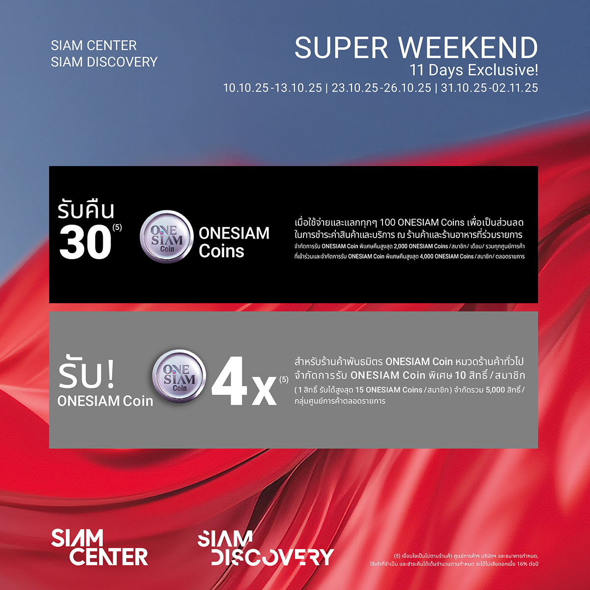 - ONESIAM Coin ที่ได้รับจะถูกบันทึกในระบบสมาชิกภายใน 3 วันทำการ และมีอายุการใช้งาน 1 ปี นับจากวันที่แลกรับสิทธิ์ โดยเงื่อนไขการใช้ ONESIAM Coin เป็นไปตามข้อกำหนดของทางศูนย์การค้าฯ และ ONESIAM SUPERAPP
