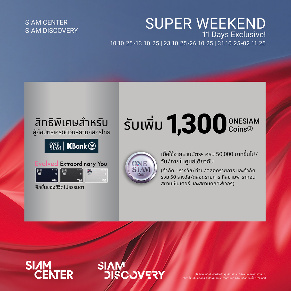 - สงวนสิทธิ์เฉพาะผู้ถือบัตรเครดิตวันสยามกสิกรไทย โดยเป็น ONESIAM MEMBER ที่มี ONESIAM SUPERAPP ที่มียอดใช้จ่ายสะสมผ่านบัตรฯ ที่ร้านค้าที่ร่วมรายการในศูนย์การค้าสยามพารากอน ระหว่างวันที่ 10 ต.ค. 68 - 13 ต.ค. 68, 23 ต.ค. 68 - 26 ต.ค. 68, 31 ต.ค. 68 – 2 พ.ย. 68 เท่านั้น