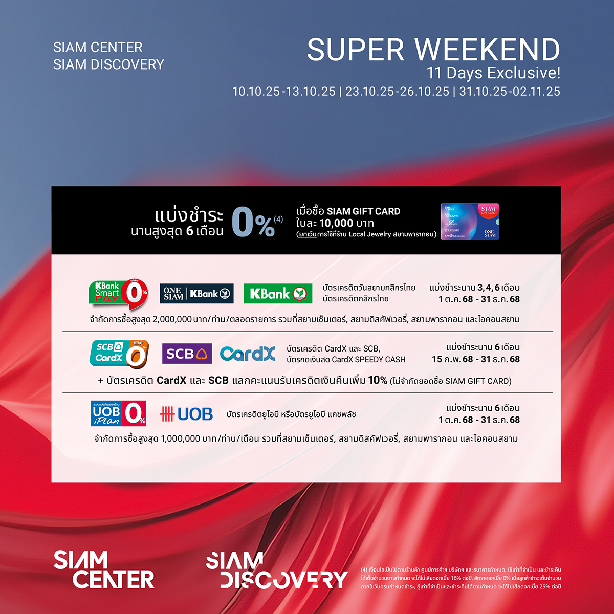 - แบ่งชำระนาน 6 เดือน(4) สำหรับบัตรเครดิต CardX และ SCB แลกคะแนนรับเครดิตเงินคืนเพิ่ม 10% (ไม่จำกัดยอดซื้อ SIAM GIFT CARD)