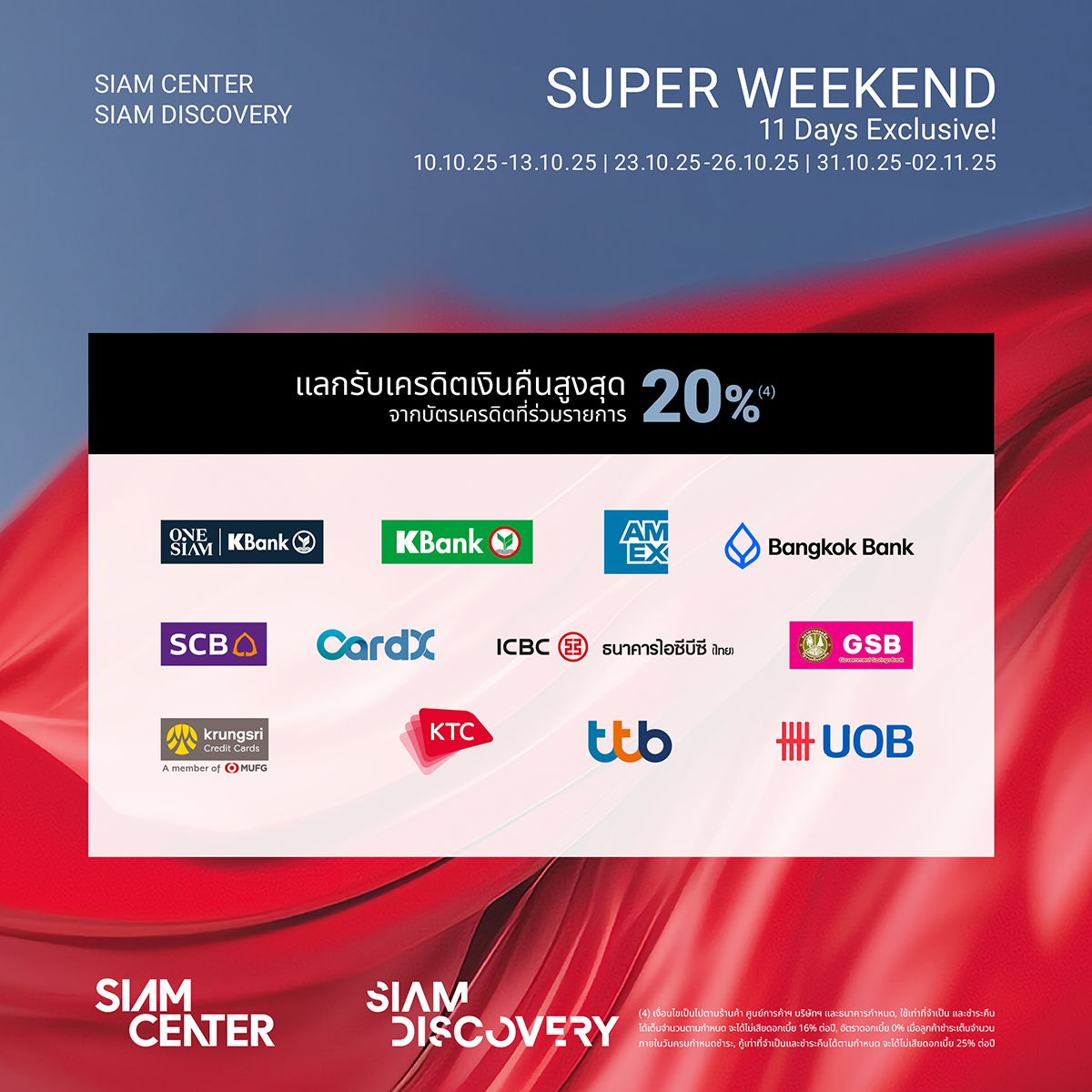 - ขอสงวนสิทธิ์ในการร่วมรายการส่งเสริมการขายเฉพาะผู้ถือบัตรฯ ที่แสดงเอกสารครบถ้วน ได้แก่ ใบเสร็จ, เซลส์สลิปตามเงื่อนไขจากร้านค้าที่ร่วมรายการ, บัตรประจำตัวประชาชนของผู้แลกรับสิทธิ์ บัตรเครดิตวันสยามกสิกรไทยที่ใช้จ่ายภายใต้ชื่อ-สกุล และหมายเลขบัตรเครดิตเดียวกัน (ไม่สามารถรวมใบเสร็จและเซลส์สลิประหว่างศูนย์การค้าได้) ลงทะเบียนภายในวันเดียวและสาขาเดียวกัน ที่ INFORMATION COUNTER ชั้น G ฝั่งนอร์ธ ชั้น 1 ฝั่ง STAR DOME สยามพารากอน ระหว่างวันที่ 10 ต.ค. 68 - 13 ต.ค. 68, 23 ต.ค. 68 - 26 ต.ค. 68, 31 ต.ค. 68 – 2 พ.ย. 68