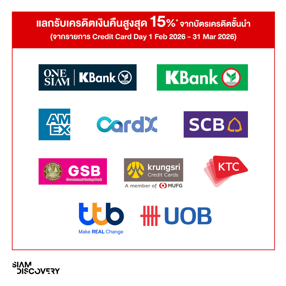 แลกรับเครดิตเงินคืนสูงสุด 15% จากบัตรเครดิตชั้นนำ (จากรายการ Credit Card Day 1 ก.พ. – 31 มี.ค. 69)