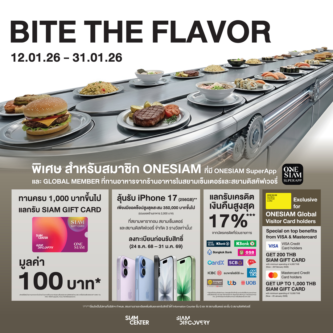 พิเศษ สำหรับสมาชิก ONESIAM ที่มี ONESIAM SuperApp และ GLOBAL MEMBER ที่ทานอาหารจากร้านอาหารในสยามเซ็นเตอร์และสยามดิสคัฟเวอรี่ ทานครบ 1,000 บาทขึ้นไป แลกรับ SIAM GIFT CARD มูลค่า 100 บาท (สำหรับซื้อสินค้าและทานอาหารจากร้านค้าและร้านอาหารที่ร่วมรายการในสยามเซ็นเตอร์และสยามดิสคัฟเวอรี่ ครบ 200 บาทขึ้นไป/ใบเสร็จ/SIAM GIFT CARD 1 ใบ) จำกัด 1 สิทธิ์/ท่าน/ศูนย์/วัน, รวมจำนวน 700 สิทธิ์/ตลอดรายการ สยามเซ็นเตอร์และสยามดิสคัฟเวอรี่
